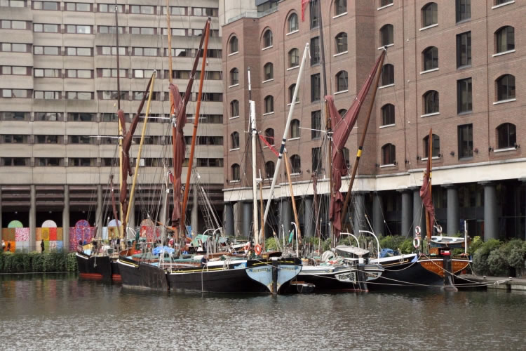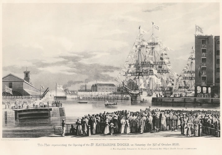 St Katharine Docks is situated east of the Tower Bridge, next to the City of London. Opened in 1828, these docks had two connected basins, the east and the west dock. A relatively long but narrow entrance lock (180 feet long, 45 feet wide) facilitated entrance into the docks from the river Thames. St Katharine Docks was among the smallest of the upstream docks, constructed within only 24 acres of land, compared to the 90 acres occupied by the neighbouring London Docks. St Katharine Docks, designed by the great Victorian engineer Thomas Telford, were revolutionary because they involved building warehouses right on the quayside so that cargo could be unloaded directly from the ships and stored. This removed the need for huge quaysides and significantly reduced the amount of time needed to unload and move goods.