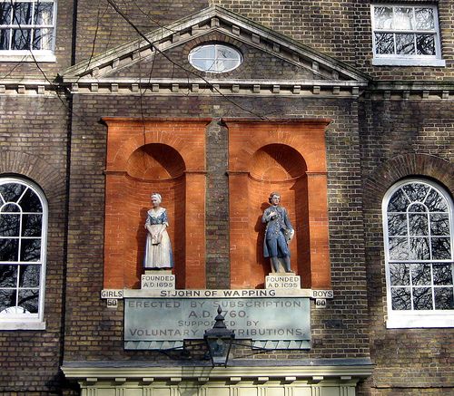 The adjoining charity school of St. John's (today transformed into luxury housing) was established in 1756 by voluntary subscriptions and an Act of Parliament. It was built for the education of pauper children in the Wapping area in basic arithmetic, reading, and writing. Girls were also taught domestic chores such as sewing and knitting whilst the boys, since they were boys, would have been given the task of chopping wood! The statues of a girl and a boy in their school uniform still decorates the façade of the old school today.