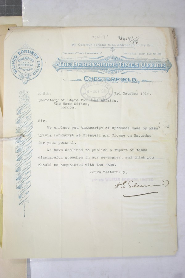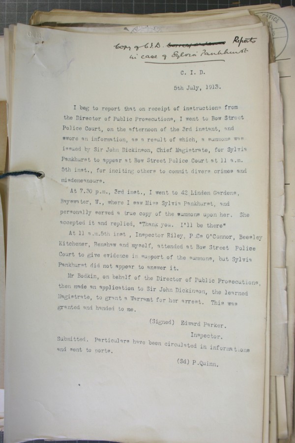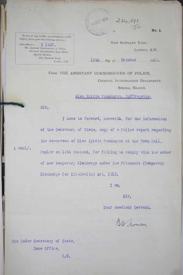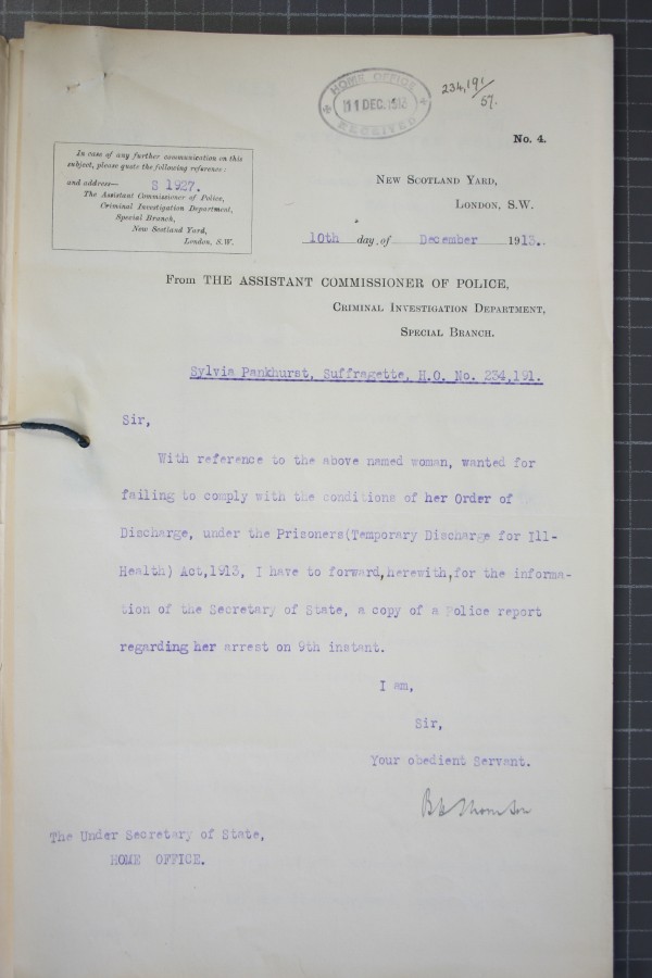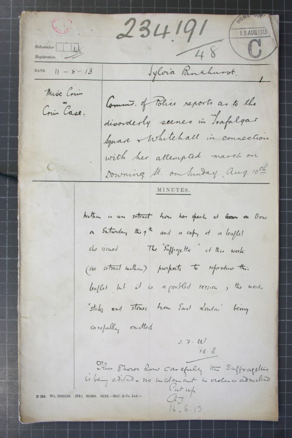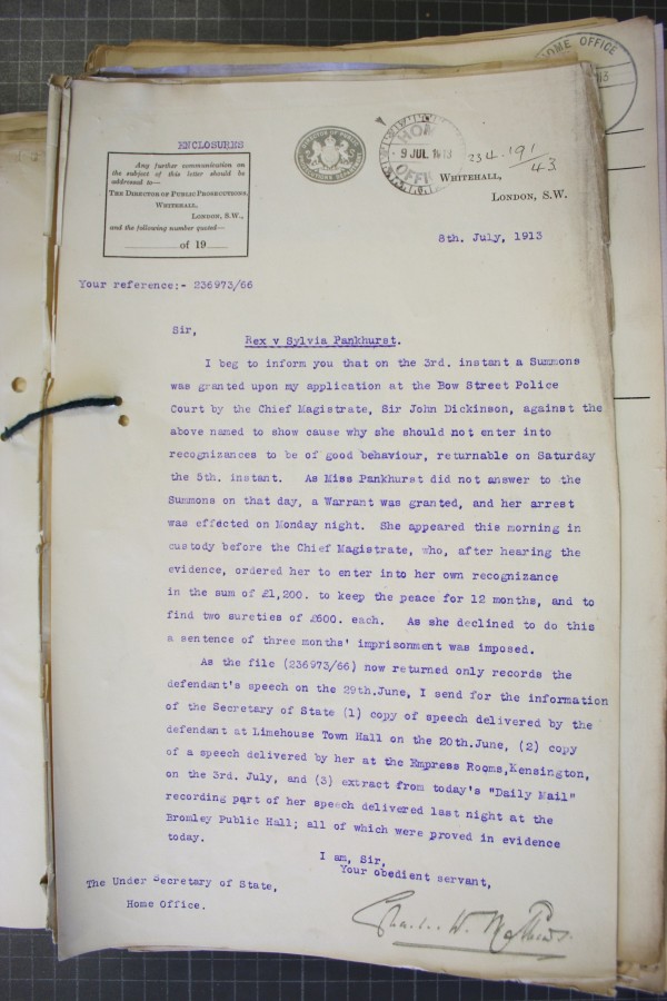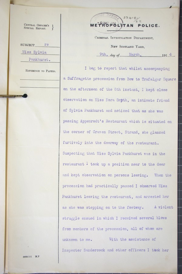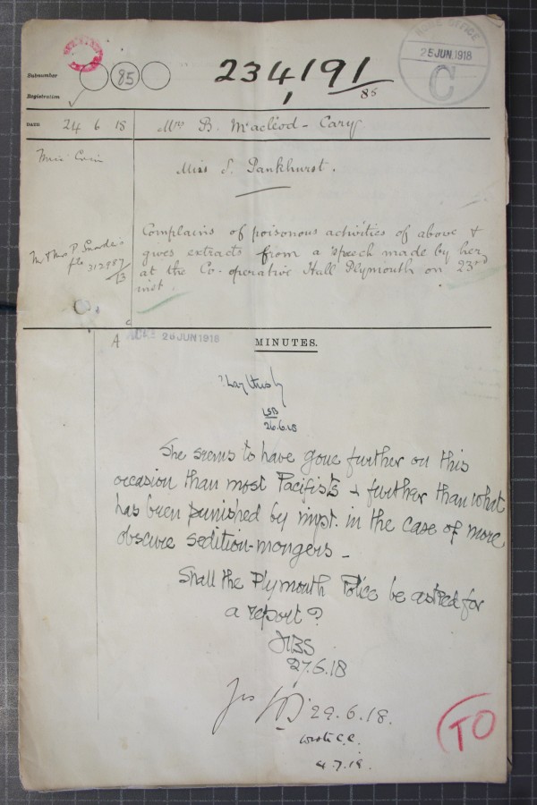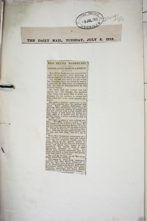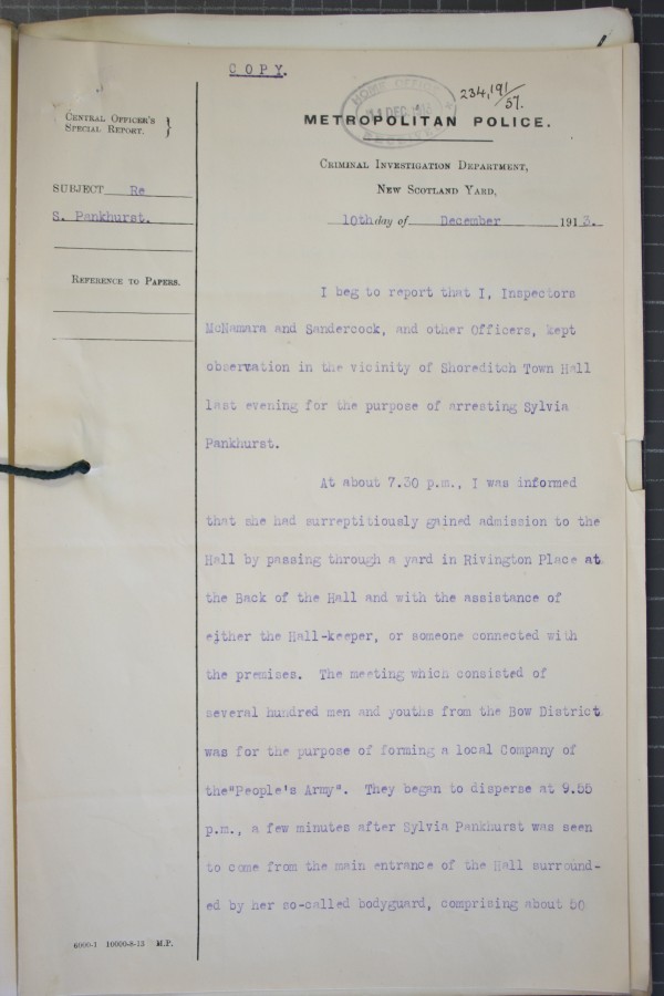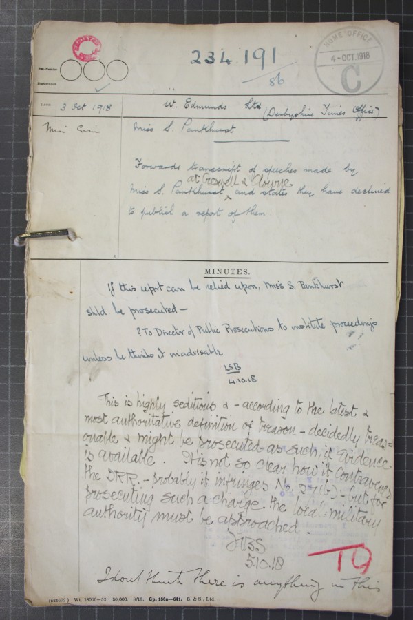 The National Archives at Kew hold numerous ‘security items’ on Sylvia which were eventually released for public viewing. The National Archives kindly allowed our volunteers to photograph many items. These documents demonstrate the impact she was having on the British establishment at the time, the fear she invoked, their efforts to silence her and her fearlessness in taking on the state. Some material is included in the documentary, but we could not include it all and these items we felt were important for the world to see and so present the most legible here. There are further files on Sylvia now released by MI5 and many more items from cabinet papers to correspondence so this is by no means an exhaustive collection.